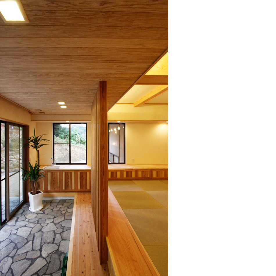 裏山を望む土間、階段も取り込みながら